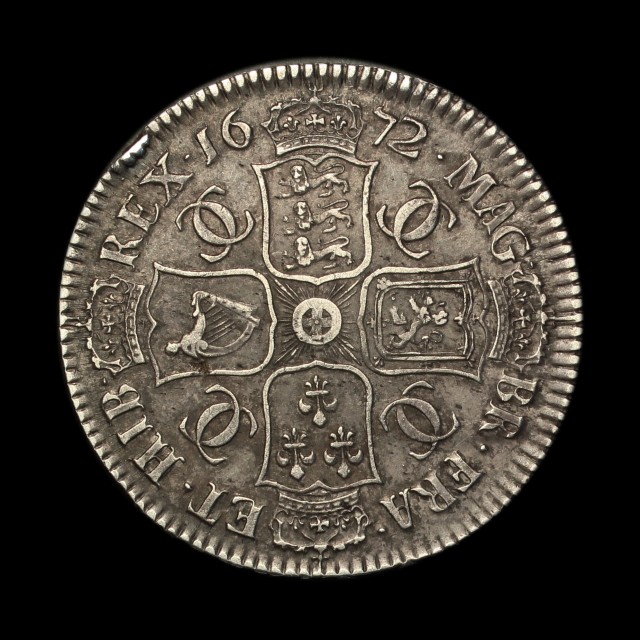 1672, fourh laureate bust right, rev. crowned cruciform shields, intelinked C's in angles, (S.3367, ESC.460)