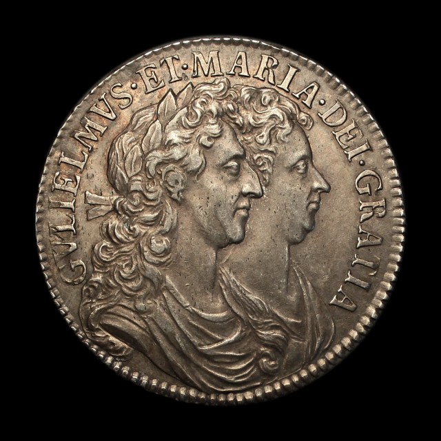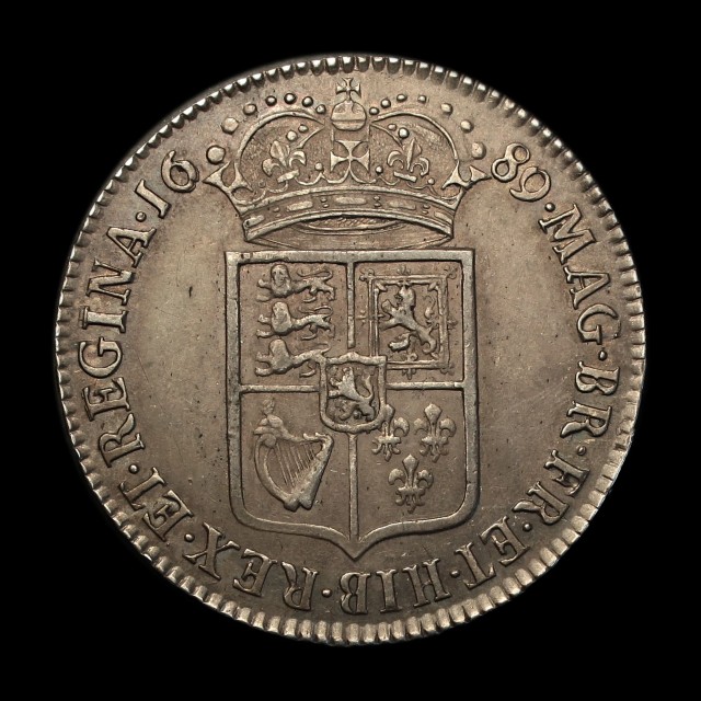 1689, first conjoined laureate busts right, rev. crowned shield, caul and interior frosted, pearls, edge PRIMO, (S.3434)