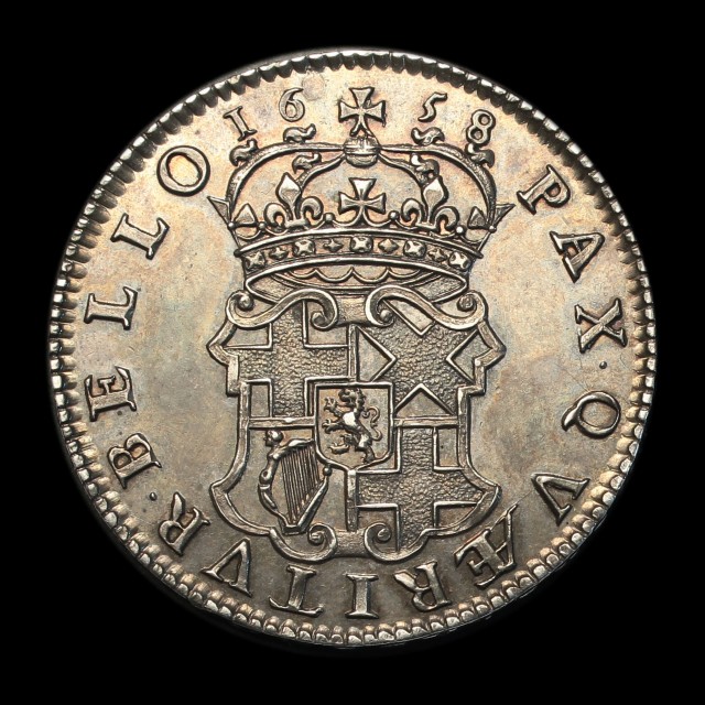 1658, laureate and draped bust left, rev. crowned shield, date above, edge lettered, (SCBC 3227A, ESC.252)