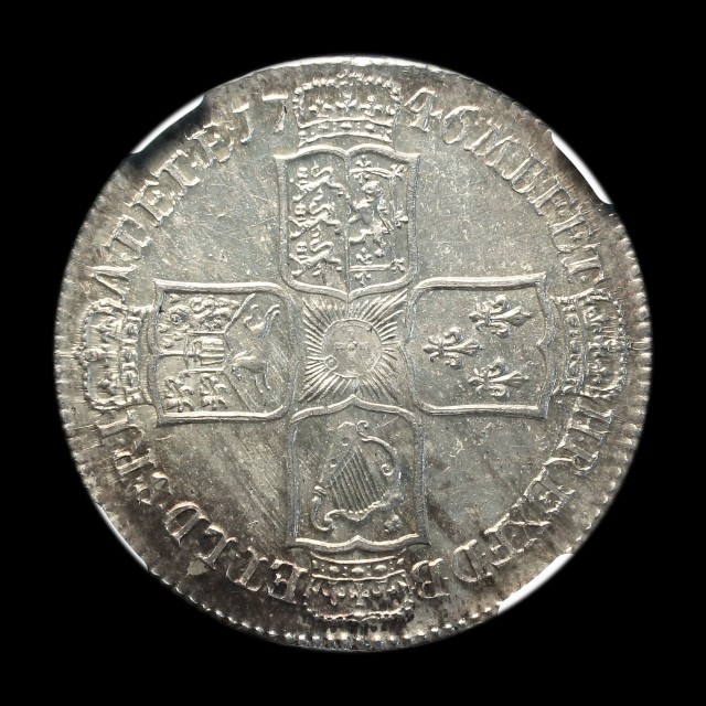George II old head halfcrowns are common and occur in all grades, though the highest grade examples are rare. The central part of the hair on the obverse is often stiill slightly flat due to the strike even on a high grade coin