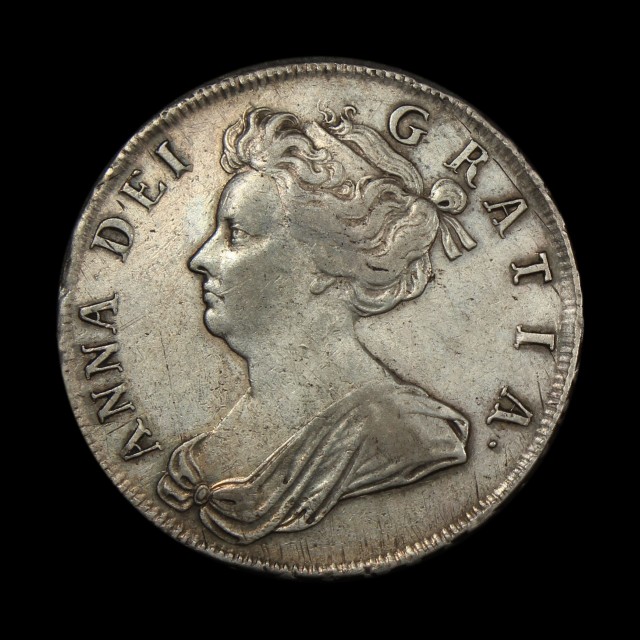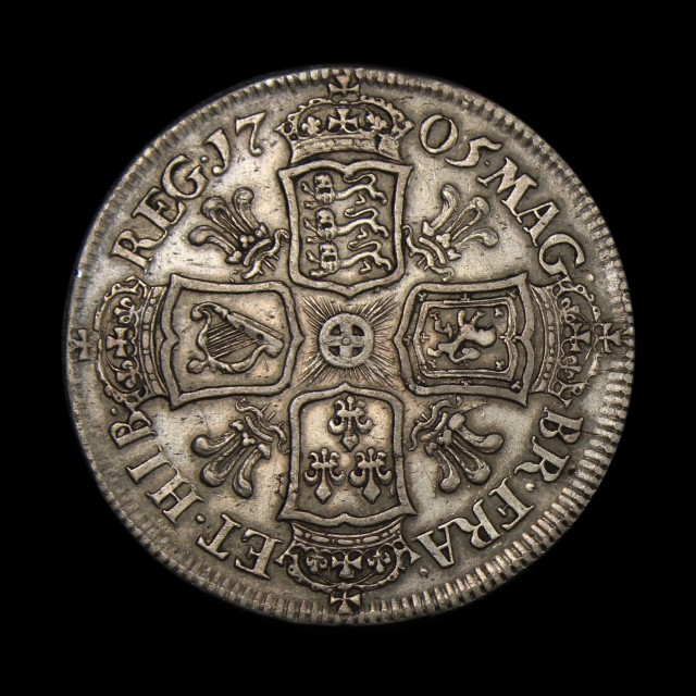 Pre-union, 1705, rev. plumes in angles, edge QVINTO (S.3581, ESC.571)