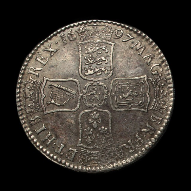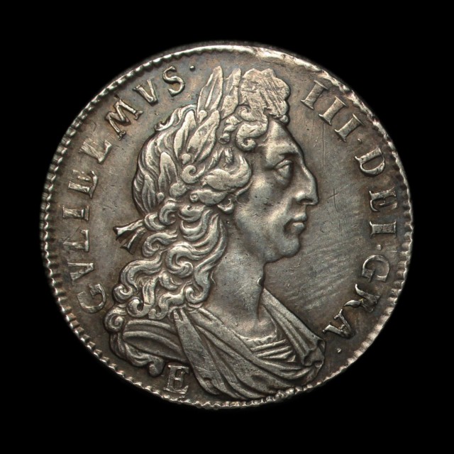 1697, Exeter mint, E below bust, rev. large shields, late harp, edge NONO, (S.3490, ESC.1077)