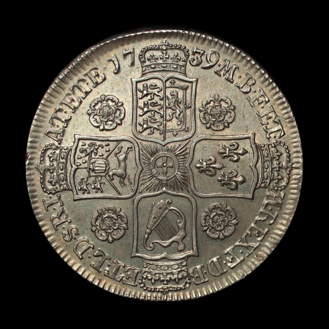 1739, young head left, rev. crowned cruciform shields, roses in angles, edge DVODECIMO, (S.3693, ESC.1679)