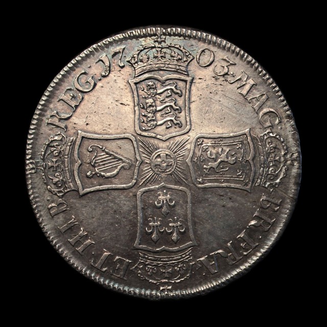 1703, pre-Union, bust left, VIGO below, rev. crowned cruciform shields, angles plain, (S.3580, ESC.1358)