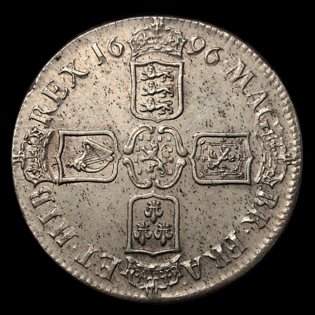 1696, first laureate bust right, rev. crowned cruciform shields, edge, OCTAVO, (S.3470, ESC.995)