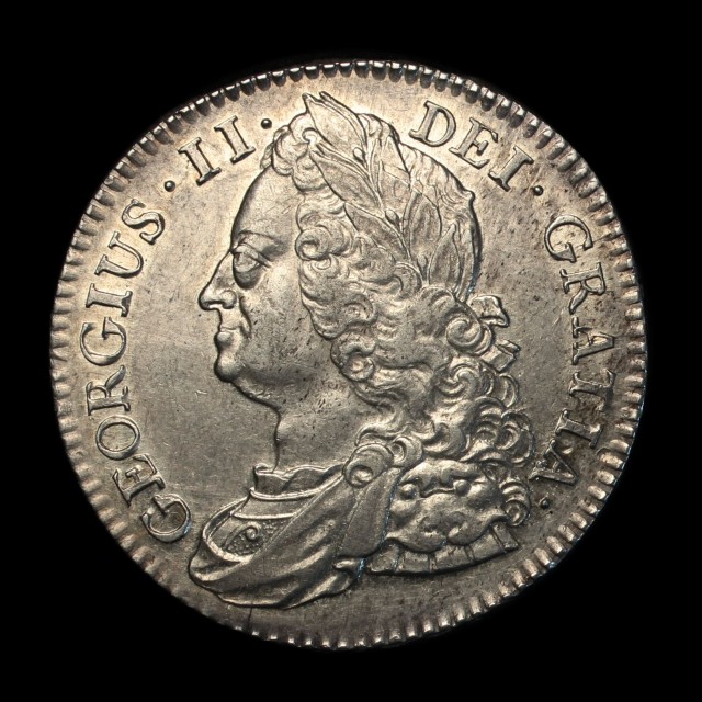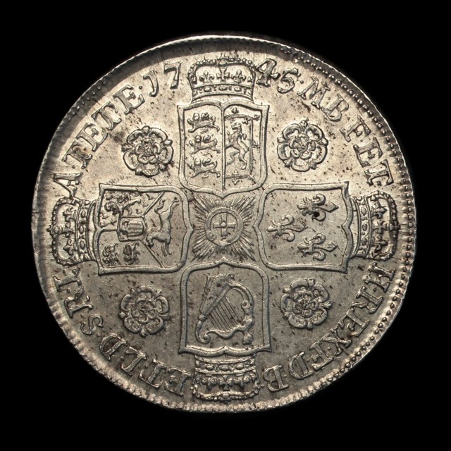 1745/5, old laureate bust left, rev. crowned cruciform shields, roses in angles, edge D.NONO, (S.3694, ESC.1686)
