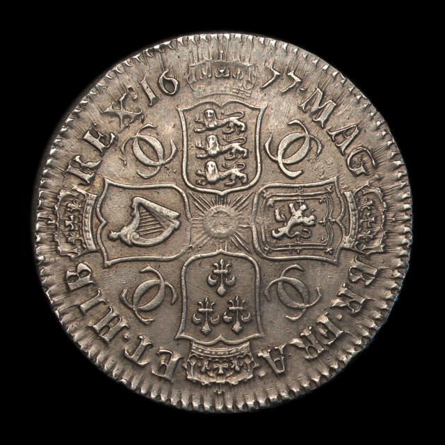 Laureate head right, rev. crowned cruciform shields, interlinked C's in angles, edge VICESIMO, (S.3367, ESC.475). Even grey tone, a handsome example, nearly extremely fine