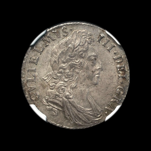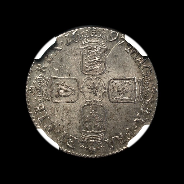William III shillings of the London mint with plain reverse are quite plentiful and do turn up in high grades. They are sometimes prone to manufacturing problems such as tin flecking, striking weakness, adjustment marks and rusty dies. Collectors should aim to find examples with good colour and without problems.
